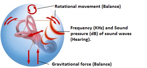 Tinnitus, Morbus Menière and other ear diseases as a result of too much noise.The following picture shows, that the hearing and balance organ is one and the same. Certain diseases and medications can damage the hair cells.